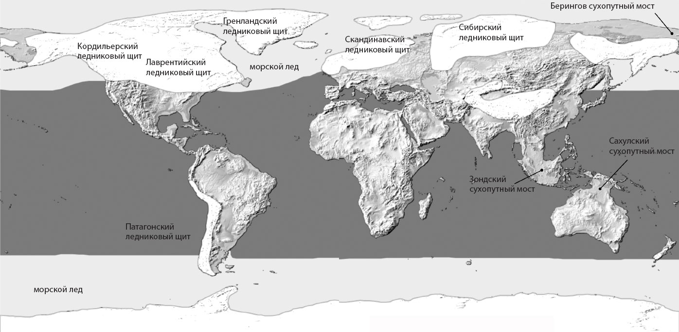 Последний ледниковый период начался примерно 117 000 лет назад и длился около 100 000 лет, до начала нынешней межледниковой эпохи голоцена[59]. На пике ледникового периода, с 25 000 до 22 000 лет назад, с севера на Северную Европу и Америку наползали, глуша все живое, колоссальные ледниковые щиты толщиной до 4 километров[60]. Другой ледниковый щит, поменьше, накрыл Сибирь, а ледяные шапки горных цепей – Альп, Анд, Гималаев, а также гористого хребта Новой Зеландии – распространились до самого низа.