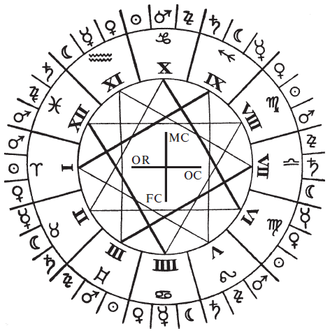На чертеже представлено вхождение Солнца в созвездие Овна в весеннее равноденствие 21—23 марта каждого года. Буквы на концах центрального креста обозначают: OR (oriental) – восточное небо; MC (Mid-Heaven) – середина неба; OC (Occidental) – западное небо; FC – нижнее небо