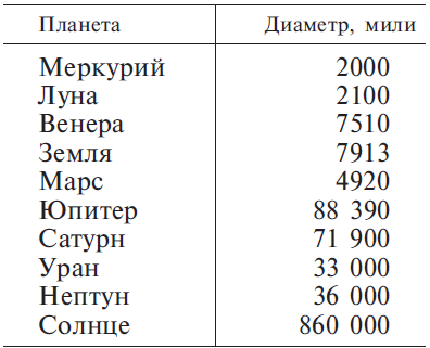 Приведенная ниже таблица показывает размеры каждой из планет и лучше всяких моих слов наглядно поясняет эту сторону вопроса.