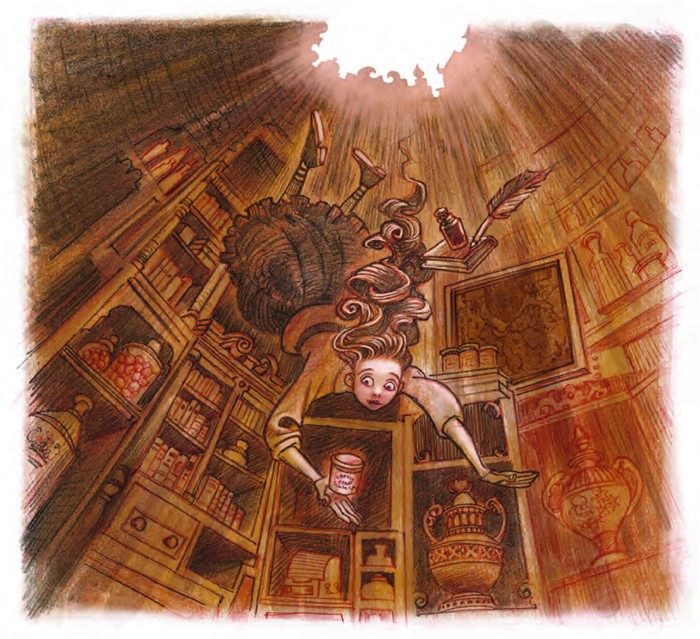 Стены колодца были уставлены шкафами и книжными полками; кое-где висели на гвоздиках картины и карты. Пролетая мимо одной из полок, она прихватила с неё банку с вареньем. На банке было написано «АПЕЛЬСИНОВОЕ», но – увы! – она оказалась пустой. Алиса побоялась бросить банку вниз – как бы не убить кого-нибудь! На лету она умудрилась засунуть её в какой-то шкаф.