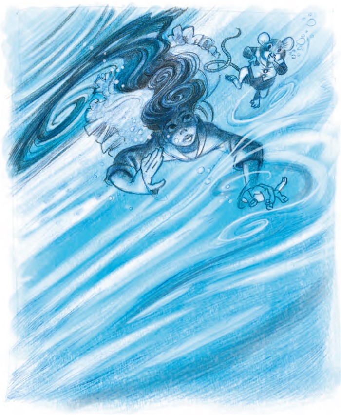 Тут она услышала какой-то плеск неподалёку и поплыла туда, чтобы узнать, кто это там плещется. Сначала она решила, что это морж или гиппопотам, но потом вспомнила, какая она теперь крошка, и, вглядевшись, увидала всего лишь мышь, которая, видно, также упала в воду.