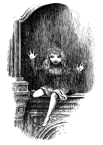 В панике Королева стала карабкаться по каминной решетке. Алисе стало жалко ее. Она осторожно, двумя пальцами подхватила Королеву и быстро перенесла ее на стол, где продолжала вопить Королевская Пешка.