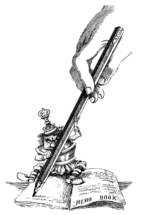 Король полез в карман и выволок оттуда, к удивлению Алисы, громадную записную книжку. Он обмакнул кончик пера в чернила и стал что-то корябать в своей книжке. Тут Алиса, хитро прищурившись, ухватилась за конец гигантской ручки, торчавшей над плечом Короля, и заставила ее писать вовсе не то, что намеревался Король.