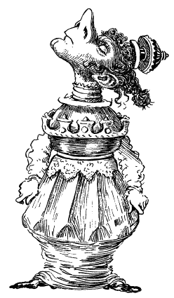 Она сдула наконец с него золу, пригладила встрепанные волосы и аккуратно поставила на стол рядом с Королевой. Король тут же грохнулся в обморок. Алиса всполошилась и бросилась за водой, чтобы привести Короля в чувство. Воды нигде не оказалось. Зато ей подвернулся пузырек чернил. Алиса растерянно вертела его в руках и тут увидела, что Король уже очнулся и о чем-то тихо шепчется с Королевой.
