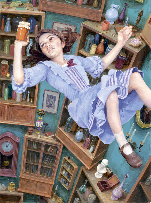 То ли колодец был очень глубок, то ли падала она очень медленно, только времени у нее было достаточно, чтобы оглядеться и поразмыслить, что же будет дальше. Сначала она попыталась разглядеть, что внизу, но там было темно, и она ничего не увидела; тогда она принялась смотреть по сторонам и заметила, что стены колодца были уставлены шкафами и книжными полками; кое-где висели на гвоздиках картины и карты. Пролетая мимо одной из полок, она прихватила с нее банку с вареньем; на банке было написано «АПЕЛЬСИНОВОЕ», но – увы! – она оказалась пустой. Алиса побоялась бросить банку вниз – как бы не убить кого-нибудь! – и умудрилась на лету засунуть ее в какой-то шкаф5.