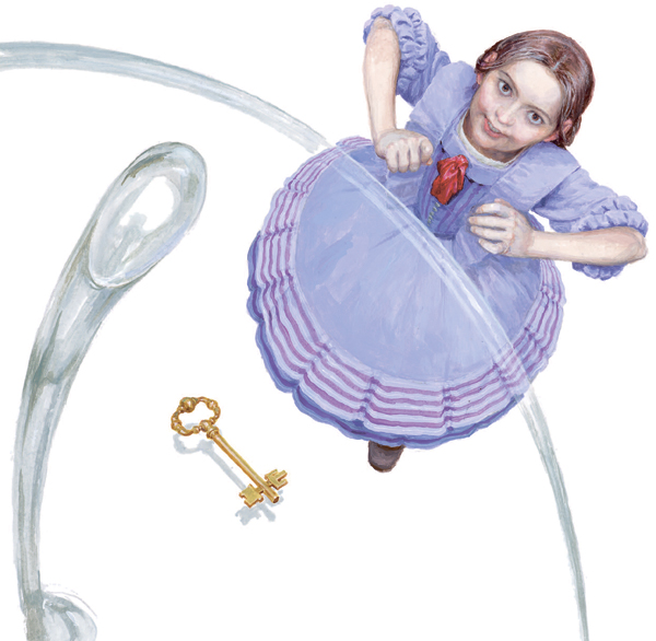 В эту минуту она ударилась головой о потолок – ведь она вытянулась футов до девяти, не меньше, – схватила со стола золотой ключик и побежала к двери в сад.