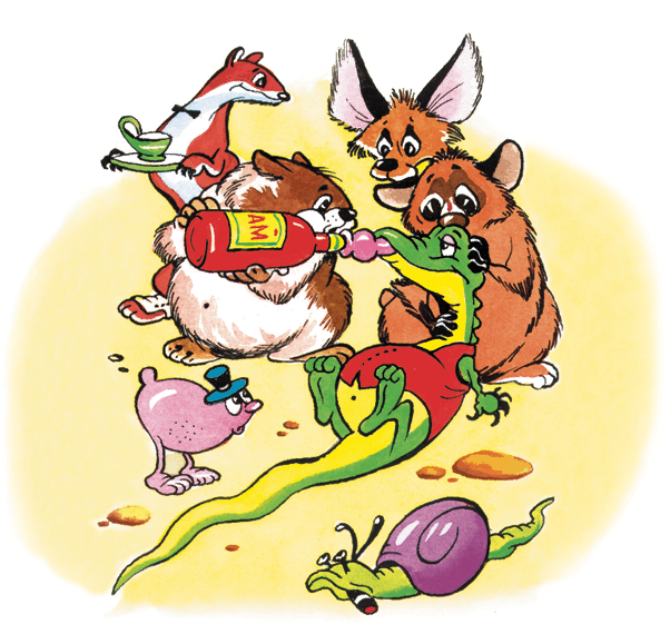 Она проглотила целиком одно печенье и с облегчением почувствовала, что стремительно уменьшается. Наконец она стала маленькой-маленькой и тут же выбежала из дому. И сразу наткнулась на целую толпу птиц и зверюшек. В самой серёдке её лежала маленькая ящерка – это и был Билл. Две морские свинки, приподняв несчастному голову, старательно пихали ему в рот горлышко бутылки.