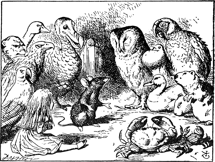‘Speak English!’ said the Eaglet. ‘I don’t know the meaning of half those long words, and, what’s more, I don’t believe you do either!’ And the Eaglet bent down its head to hide a smile: some of the other birds tittered audibly.