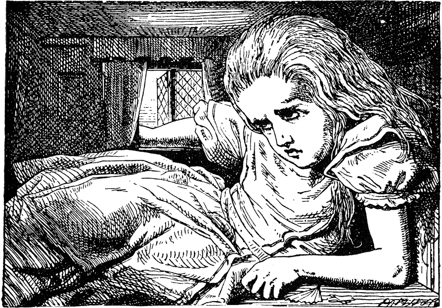 It did so indeed, and much sooner than she had expected: before she had drunk half the bottle, she found her head pressing against the ceiling, and had to stoop to save her neck from being broken. She hastily put down the bottle, saying to herself ‘That’s quite enough – I hope I shan’t grow any more – As it is, I can’t get out at the door – I do wish I hadn’t drunk quite so much!’