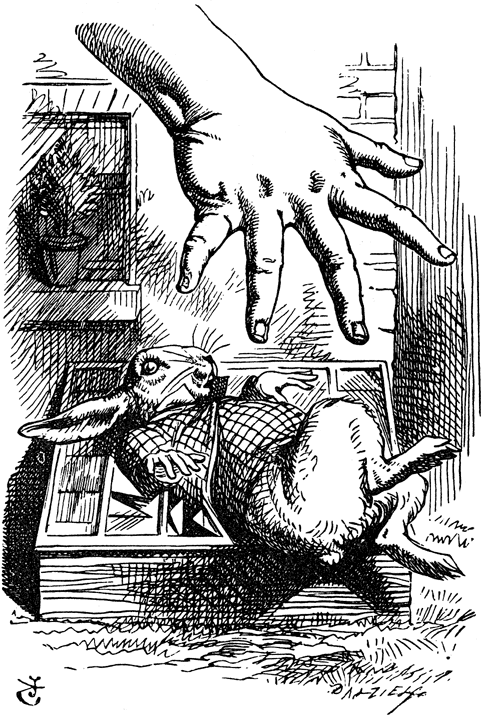 ‘Mary Ann! Mary Ann!’ said the voice. ‘Fetch me my gloves this moment!’ Then came a little pattering of feet on the stairs. Alice knew it was the Rabbit coming to look for her, and she trembled till she shook the house, quite forgetting that she was now about a thousand times as large as the Rabbit, and had no reason to be afraid of it.