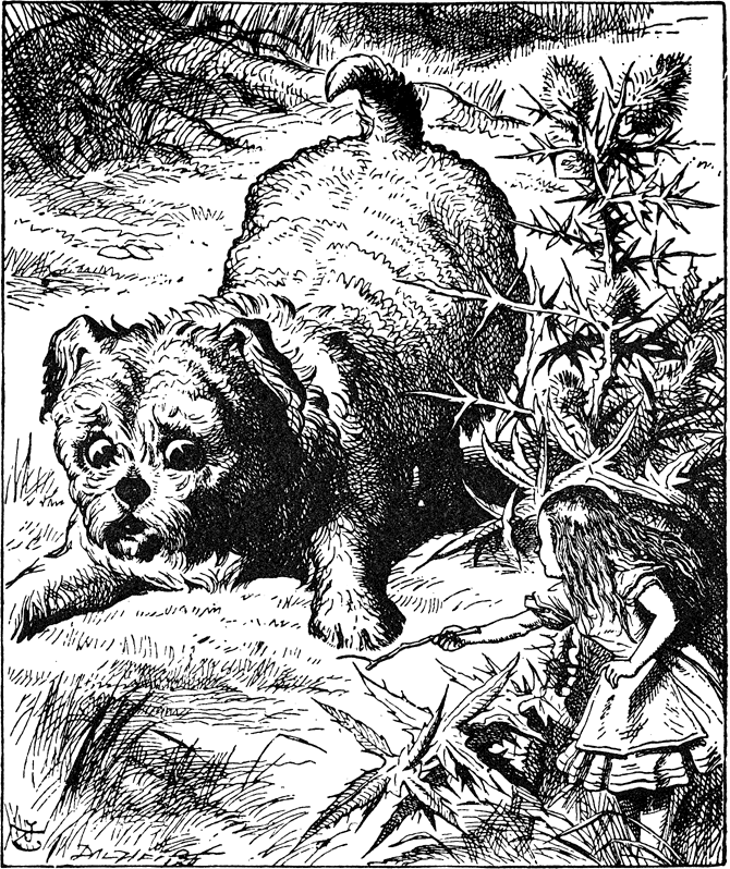 Hardly knowing what she did, she picked up a little bit of stick, and held it out to the puppy; whereupon the puppy jumped into the air off all its feet at once, with a yelp of delight, and rushed at the stick, and made believe to worry it; then Alice dodged behind a great thistle, to keep herself from being run over; and the moment she appeared on the other side, the puppy made another rush at the stick, and tumbled head over heels in its hurry to get hold of it; then Alice, thinking it was very like having a game of play with a cart-horse, and expecting every moment to be trampled under its feet, ran round the thistle again; then the puppy began a series of short charges at the stick, running a very little way forwards each time and a long way back, and barking hoarsely all the while, till at last it sat down a good way off, panting, with its tongue hanging out of its mouth, and its great eyes half shut.