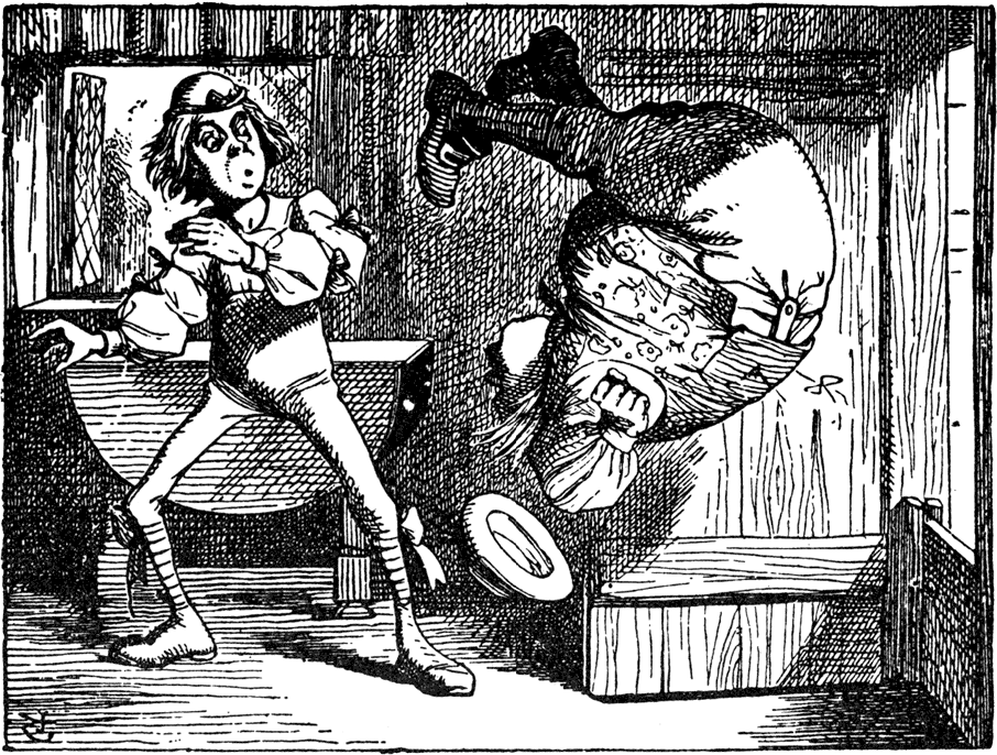 ‘Oh,pleasemind what you’re doing!’ cried Alice, jumping up and down in an agony of terror. ‘Oh, there goes his preciousnose’; as an unusually large saucepan flew close by it, and very nearly carried it off.