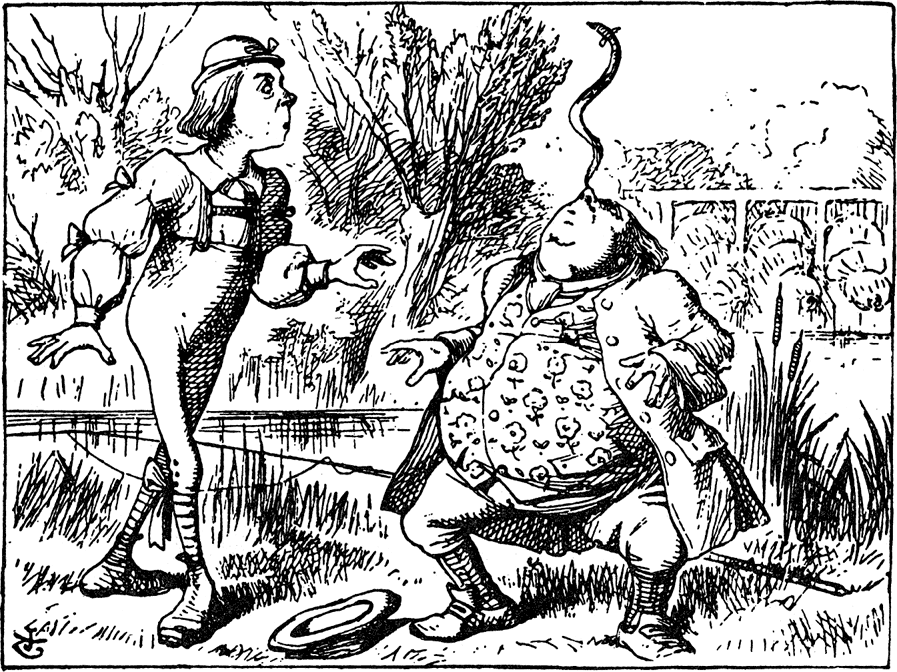 For a minute or two she stood looking at the house, and wondering what to do next, when suddenly a footman in livery came running out of the wood – (she considered him to be a footman because he was in livery: otherwise, judging by his face only, she would have called him a fish) – and rapped loudly at the door with his knuckles. It was opened by another footman in livery, with a round face, and large eyes like a frog; and both footmen, Alice noticed, had powdered hair that curled all over their heads. She felt very curious to know what it was all about, and crept a little way out of the wood to listen.