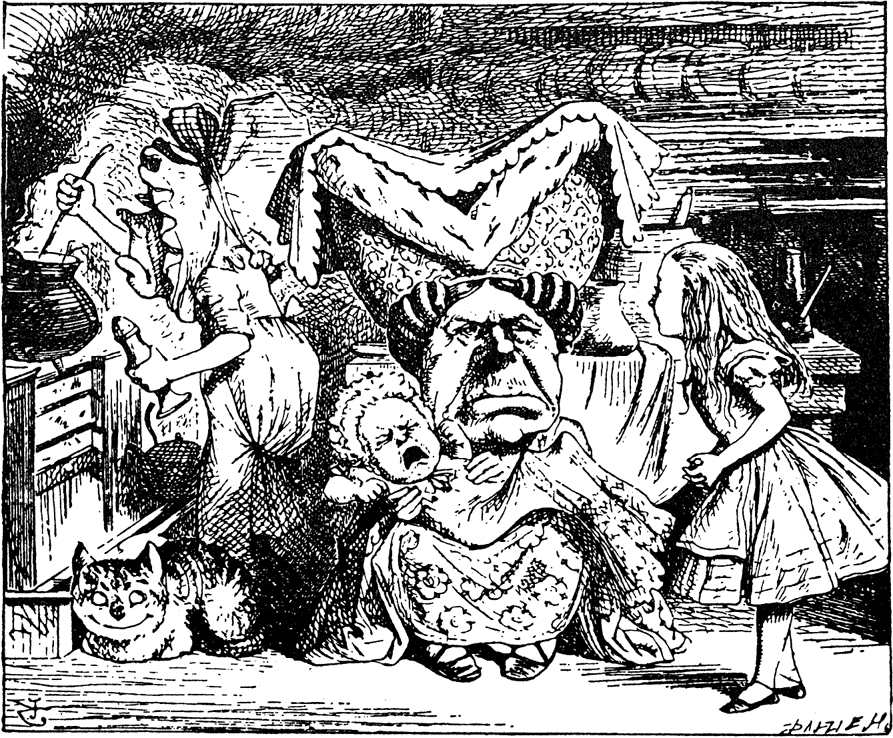 ‘Wow! wow! wow!’While the Duchess sang the second verse of the song, she kept tossing the baby violently up and down, and the poor little thing howled so, that Alice could hardly hear the words—