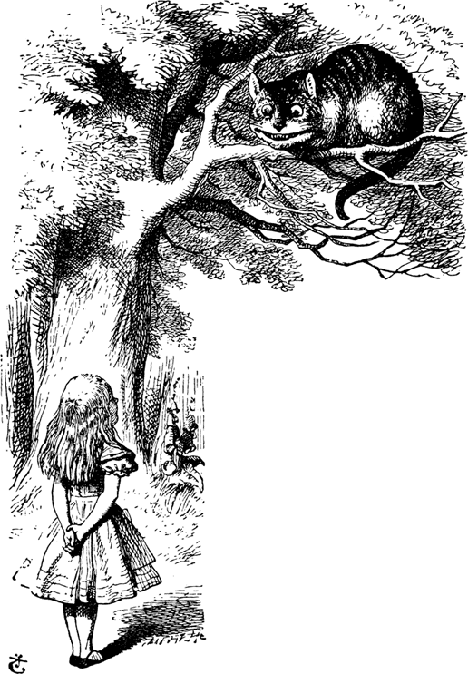 ‘Cheshire Puss,’ she began, rather timidly, as she did not at all know whether it would like the name: however, it only grinned a little wider. ‘Come, it’s pleased so far,’ thought Alice, and she went on. ‘Would you tell me, please, which way I ought to go from here?’