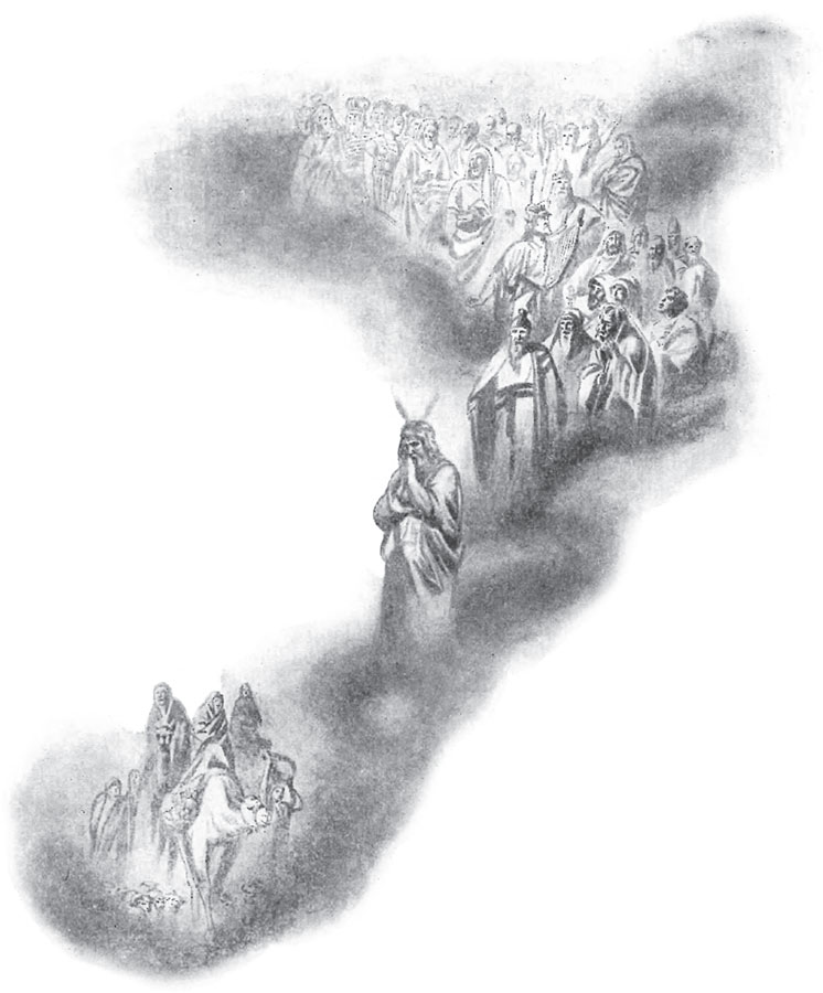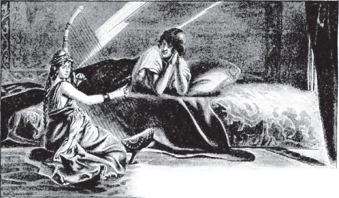 Когда Иуда проснулся, солнце уже поднялось над горными вершинами; повсюду в воздухе уже порхали голуби, наполняя его мельканием белых крыльев; на юго-востоке в небо вздымалась громада Храма, сверкая золотом на лазури неба. Все эти привычные ему картины он удостоил мимолетным взглядом; но на краешке лежанки, рядом с ним, сидела девушка, которой едва ли минуло пятнадцать лет. Держа на коленях небель и грациозно касаясь его струн, она негромко пела. Повернувшись к ней, Иуда вслушался в слова ее песни: