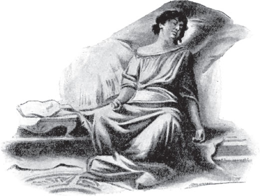 Девушка носила имя Тирца. Лицом и сложением она очень походила на брата и принадлежала к такому же еврейскому типу. Так же как и брат, она очаровывала всех выражением детской невинности на лице. Домашняя обстановка и доверие, которое они с братом питали друг к другу, вполне допускали ту небрежность в одежде, которую Тирца себе позволила сейчас. Легкая сорочка, схваченная застежкой на правом плече, свободно падала вниз по ее спине, проходя под левой рукой и скрывая тело выше талии, но оставляя руки полностью обнаженными. Поясок стягивал складки одеяния, обозначая начало юбки. Головной убор был очень простым, но весьма шел девушке – шелковая шапочка пурпурно-лилового цвета, поверх которой был накинут полосатый шарф из того же материала с богатой вышивкой, обвивавший голову легкими складками так, чтобы не увеличивать ее зрительно; все это венчалось кисточкой, спадавшей набок с верхушки шапочки. Пальцы и мочки ушей девушки были украшены золотыми кольцами, на запястьях и на лодыжках позвякивали золотые же браслеты; на шее ее красовалось золотое ожерелье, изысканно перевитое целой паутиной цепочек, на которых покачивались жемчужины. Глаза были подведены, ногти на пальцах покрыты краской. Волосы, заплетенные в две косы, спускались по спине. На щеки перед ушами падало по завитому локону. Никто не смог бы устоять перед ее красотой, утонченностью и изяществом.
