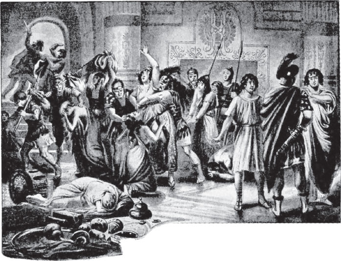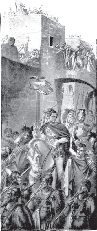 Верная служанка вошла в комнату и поставила поднос с завтраком на стул перед братом и сестрой; затем, держа в руках белую салфетку, выпрямилась, готовая служить им. Они ополоснули пальцы в чаше с водой и как раз вытирали их, когда шум внизу привлек их внимание. Прислушавшись, они различили звуки маршевой музыки, доносившейся с северной улицы.