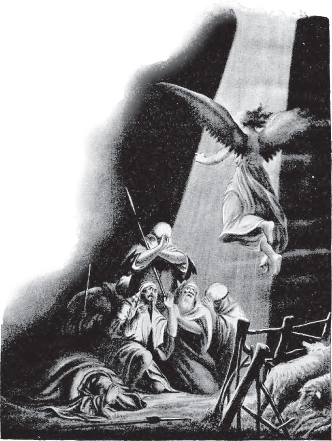 У входа в овчарню, завернувшись поплотнее в свою накидку, прохаживался караульный; временами он останавливался, заслышав возню в гуще дремлющих овец или далекое тявканье шакала на склоне горы. Приближалась полночь, время тянулось медленно; но наконец полночь наступила. Срок его дежурства истек; теперь можно было погрузиться в глубокий сон без сновидений, которым труд благословляет своих усталых детей. Он уже направился было к костру, но приостановился; все пространство вокруг него залил свет, мягкий и белый, похожий на лунный. Затаив дыхание, он ждал. Свет становился ярче; стали различимы предметы, не видимые ранее. На поле словно опускался покров. Холод страха пронзил пастуха. Он взглянул вверх; свет лился словно из окна в небе, в которое он смотрел; свет этот сиял царственным блеском, и пастух в страхе закричал: