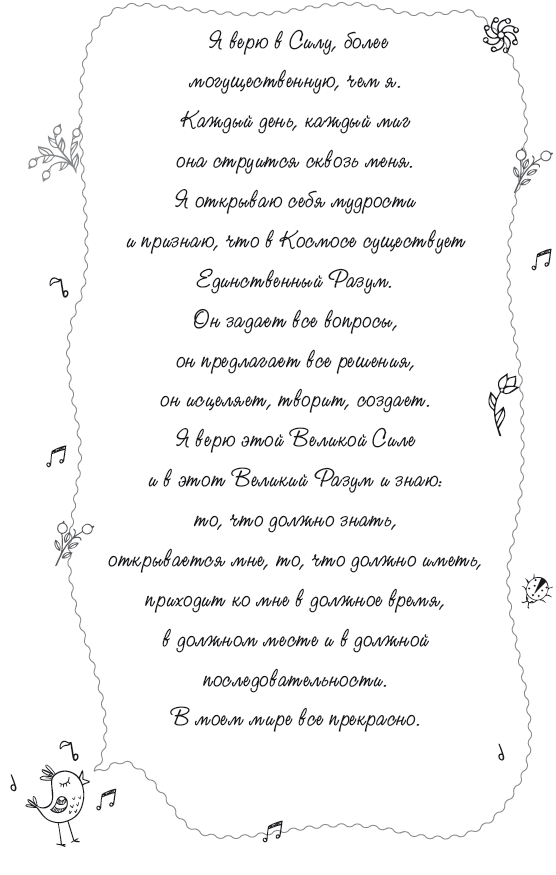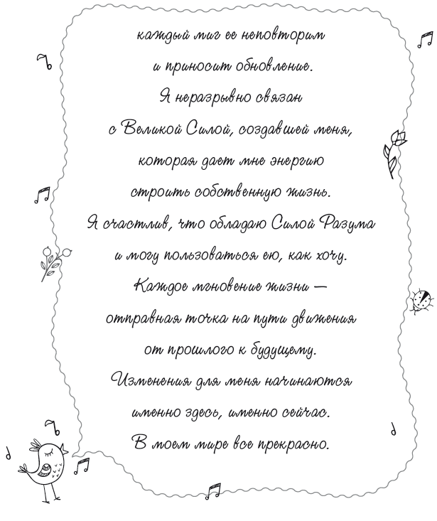 Каждая глава открывается аффирмацией, которая хороша для использования именно в той области жизни, в которой у вас возникли проблемы. Уделите два-три дня изучению каждой главы. Многократно повторяйте и записывайте аффирмацию.