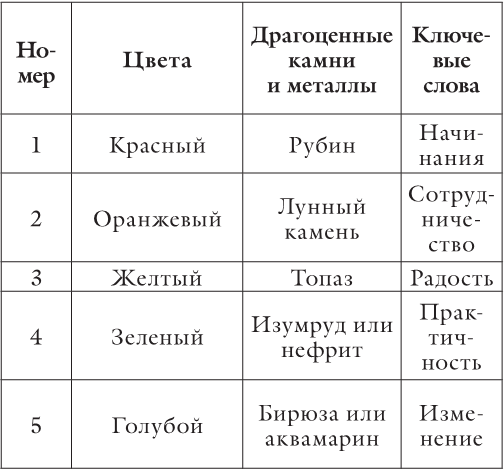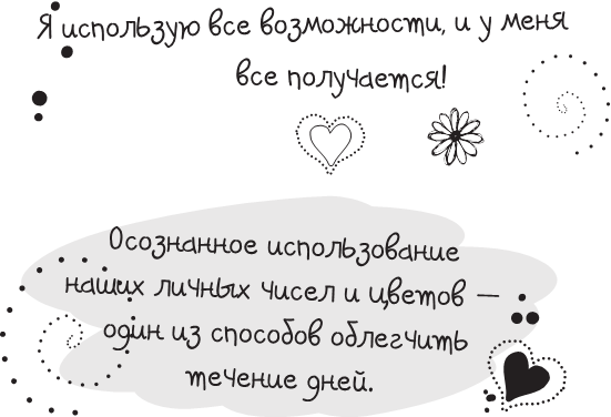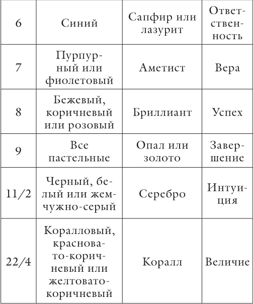 Как вы увидите далее, каждый прожитый вами день (личный день) имеет цвет, вибрации которого совпадают с числом этого дня… Каждый день также имеет драгоценный камень, резонирующий с этим цветом и числом. Драгоценные камни, как и цвета, имеют вибрации, то есть, если их носить, они могут усилить желаемое настроение. Для каждого личного дня существует и ключевая фраза, создающая его атмосферу.
