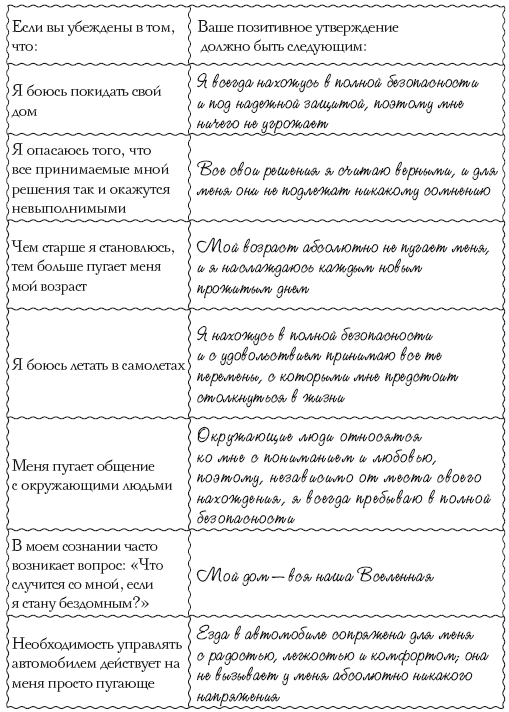 Выберите одно из наиболее сильных своих опасений среди тех, что вы перечислили в предыдущем упражнении. Представьте себе, что вам удалось побороть этот свой страх: вы наконец-то победили его и обрели свободу, мир и покой в душе. Запишите какое-нибудь позитивное утверждение, после чего повторите его 25 раз. Еще раз вспомните о той огромной силе, которой обладают все ваши действия!