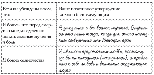 После каждого упомянутого ниже тематического раздела запишите, чего вы больше всего боитесь в данной области. Затем подумайте о позитивном утверждении, которое наиболее эффективно помогло бы вам в борьбе с вашими опасениями.