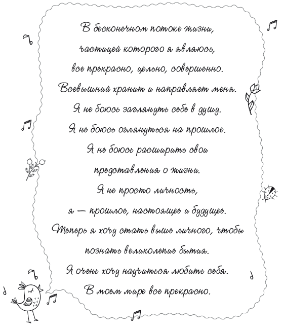 Прошлое невозможно изменить, будущее определяется сегодня нашими мыслями и убеждениями. Во имя нашей свободы необходимо понять, что наши родители старались все делать как можно лучше с присущим им жизненным опытом. Они, как и мы, ощущали свою беспомощность, поэтому могли научить только тому, чему их самих когда-то научили.