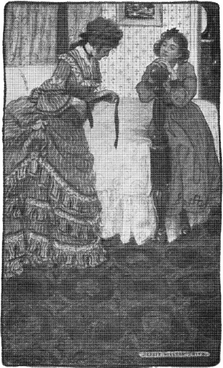 “You are fourteen; and we consider ourselves young ladies at that age,” continued Fanny, surveying, with complacency, the pile of hair on the top of her head, with a fringe of fuzz round her forehead, and a wavy lock streaming down her back; likewise, her scarlet-and-black suit, with its big sash, little pannier, bright buttons, points, rosettes – and, heaven knows what. There was a locket on her neck, earrings tinkling in her ears, watch and chain at her belt, and several rings on a pair of hands that would have been improved by soap and water.