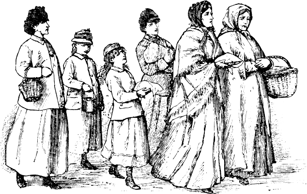 Вскоре всё было готово, и семейство Марч отправилось в путь. Со стороны утреннее шествие с рождественским завтраком в руках могло показаться достаточно забавным. Но, к счастью для нашей маленькой процессии, люди ещё не вышли на улицу, и, так и не попавшись никому на глаза, семейство переулками добралось до цели.