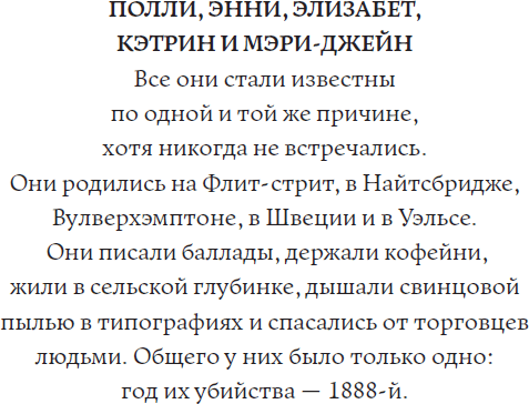 Мастерский текст, как и сама книга. Он словно очеловечивает этих женщин. А Джек-потрошитель на задней обложке не упоминается ни разу. В этой рекламе – возрождение, рассказ о жизни, а не мрачное и трагичное погружение в смерть.