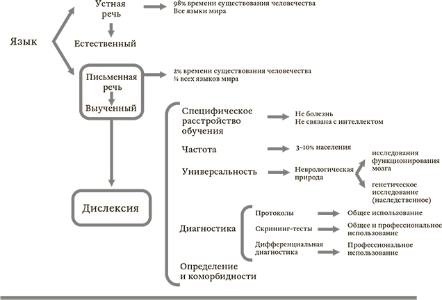 СОВРЕМЕННОЕ ОПРЕДЕЛЕНИЕ ДИСЛЕКСИИВ настоящее время существует три широко принятых понимания термина «дислексия». Среди профессиональных психологов и психотерапевтов отправной точкой принято считать определение, опубликованное в последнем издании «Диагностического и статистического руководства по психическим расстройствам» (Diagnostic and Statistical Manual of Mental Disorders, или DSM-5) от 2013 года, в котором не употребляется слово «дислексия», а используется альтернативный термин для обозначения типичных трудностей в процессе обучения, связанных с отсутствием четкого и беглого распознавания слов, нарушением понимания текста и плохой орфографией (American Psychiatric Association 2013). Этот термин – специфическое нарушение способности к обучению. После постановки диагноза необходимо определить, в чем выражается данное нарушение, а именно: 1) трудности в чтении (точность, скорость и беглость чтения, а также понимание прочитанного); 2) сложности в выражении мыслей на письме (знание правил орфографии, грамматики и пунктуации, ясность и последовательность изложения мыслей в письменной форме); 3) проблемы с математическими операциями (понятие числа, запоминание арифметических операций, правильный и беглый счет и математические рассуждения). Каждое из перечисленных выше проявлений обозначается терминами дислексия, дисграфия и дискалькулия соответственно.