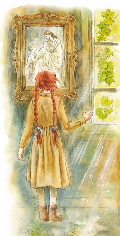Энни быстро направилась сквозь прихожую в гостиную, однако назад не вернулась. Прождав её минут десять, Марилла отложила вязание, нахмурилась и пошла за ней. Девочка нашлась перед картиной, висевшей в простенке между окнами. Маленькая и худенькая, стояла она, замерев в таинственных бело-зелёных бликах света, который струился сквозь яблони и виноградные лозы из сада, и глаза её пламенели мечтой.