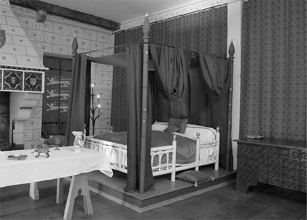 Покои супружеской четы выполняли несколько функций: служили одновременно кабинетом, библиотекой, общей комнатой и спальней, но там почти всегда стояла настоящая деревянная кровать. Нельзя точно сказать, как выглядели те кровати, потому что средневековые художники, как правило, не умели правильно передавать пропорции и масштаб. Реконструируя кровать Эдуарда I для средневекового дворца в лондонском Тауэре, мы обратились к документам, в которых указывались расходы на зеленые столбики, расписанные звездами, и на цепи для соединения различных частей королевского ложа. Иллюстрация того периода, изображающая зачатие Мерлина, подсказала нам конструкцию. Кровать Эдуарда I была разборной, потому что король постоянно путешествовал по стране, и слуги по прибытии на место очередной стоянки скрепляли части кровати цепями.