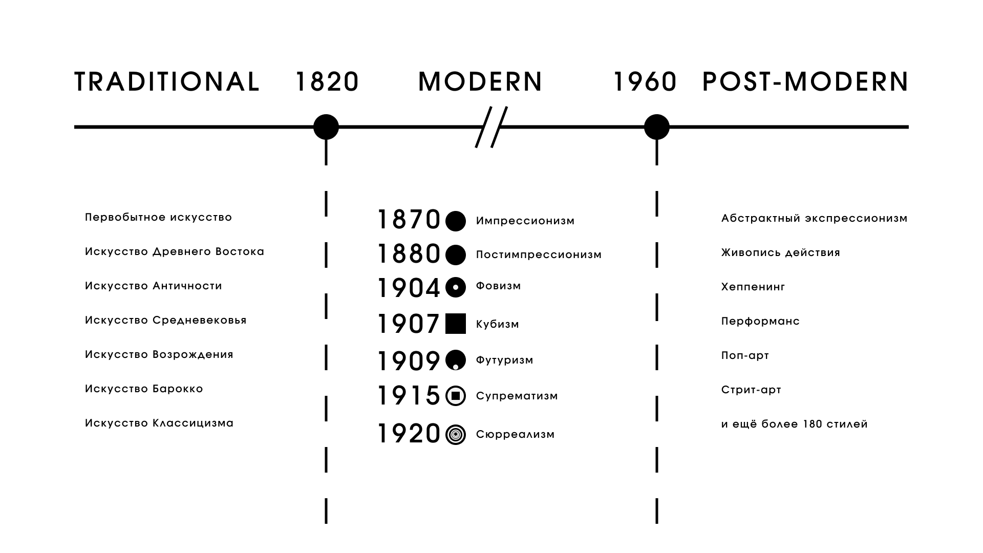 Если представить себе тайм-лайн, то есть линию времени развития живописных практик (см. рис. 1), то схематично ее можно разделить на три неравные части: