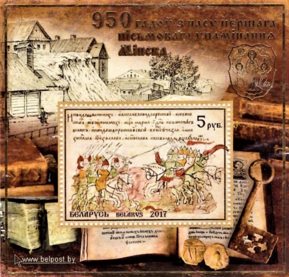 3 сакавіка 2017 года Міністэрства сувязі і інфарматызацыі Рэспублікі Беларусь выпусьціла ў абарачэньне паштовы блёк «950 гадоў з часу першага пісьмовага ўпамінаньня Менску». У аснове маркі – мініяцюра Радзівілаўскага летапісу «Бітва на рацэ Нямізе». У аснове спэцштэмпэля – пячатка першага Менскага князя Глеба Усяславіча.