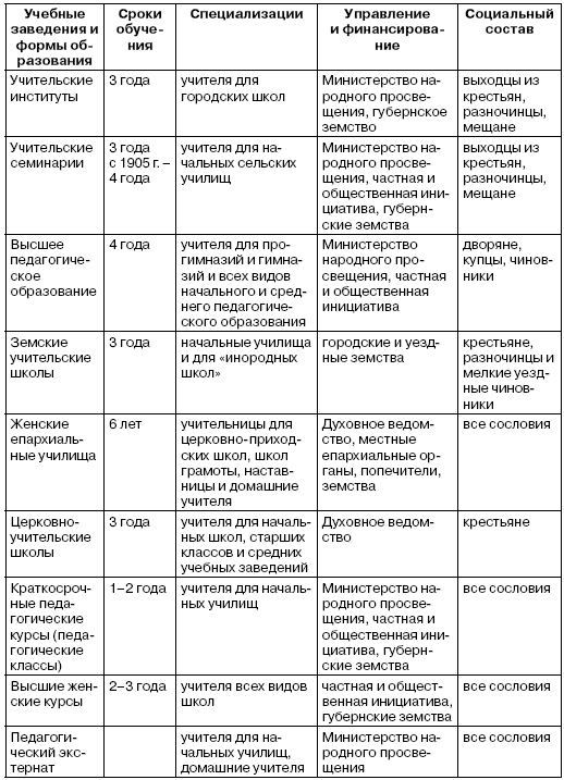 В начале XX века управление педагогическим образованием находилось в ведении Министерства народного просвещения, Священного Синода, Ведомства учреждений императрицы Марии Федоровны, а организационно-административная деятельность велась на местах через земства и попечителей учебных округов. В таблице 1 представлены формы учебных заведений, срок обучения, специализация, социальный состав и уровни управления и финансирования образованием в России начала XX века.