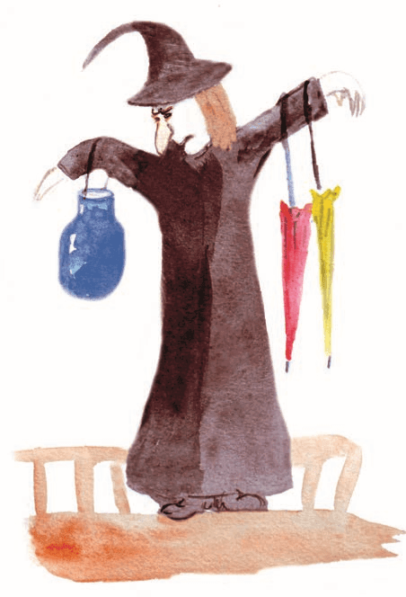 И вот на следующее утро пять сильных и ужасных Злых Волшебников пустились в путь и вскоре ступили на тропу, ведущую к болоту. Стараясь не шуметь, они пересекли болото и незаметно подобрались к домику Ух-Брюха. Потом они залегли в окрестных кустах и отправили на разведку Злого Волшебника по кличке Пиявка. Он был тонкий, извилистый и очень хорошо прятался в траве. Пиявка подполз к самому домику и чуть не вскрикнул от удивления! Он увидел, как Ух-Брюх подметает пыль на веранде, а в углу, как какая-то вешалка, стоит Смертоглаз с открытым ртом и растопыренными руками. На эти руки Ух-Брюх повесил зонтик и бидончик для сбора грязи. Какой позор для всех Злых Волшебников!