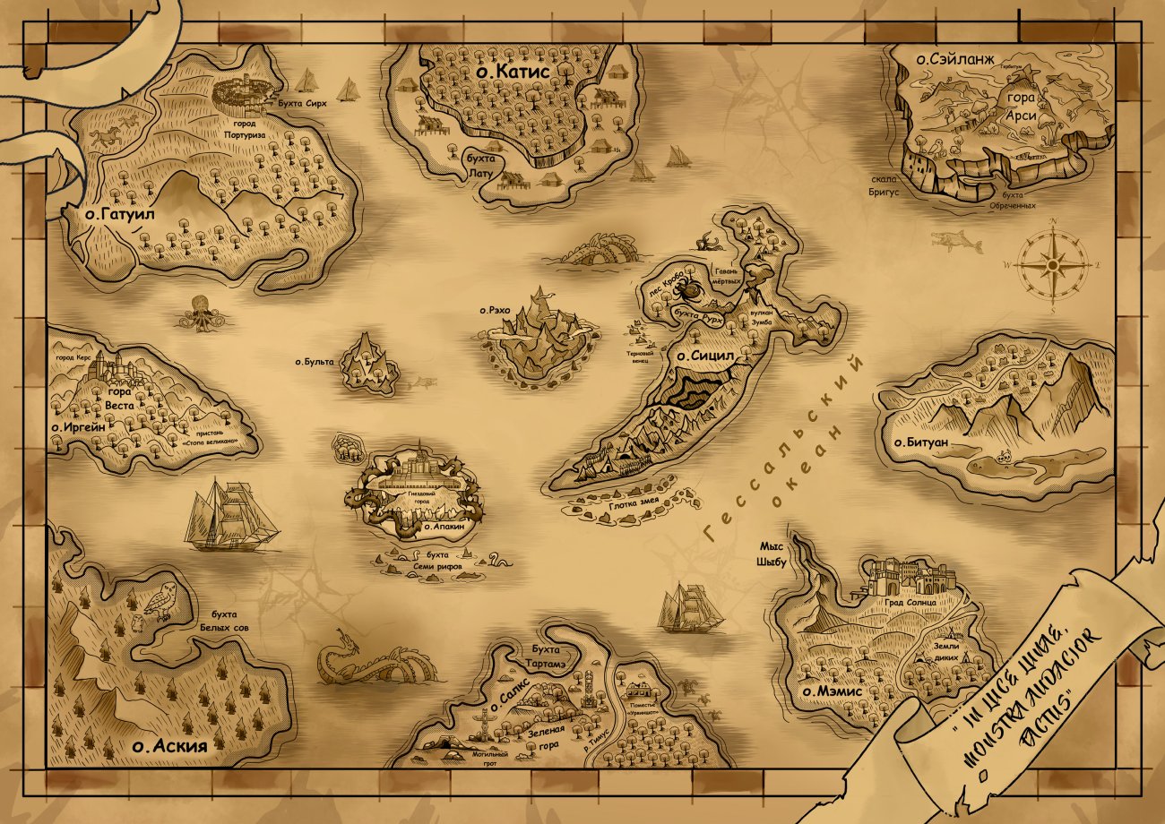 – Во время притаргского заката, – продолжила она, – что воспылал три луны назад, заката ами́йских охотников и диких воплей из бездны Гесса́льских вод, мои воины узрели растерзание вашей «Северной Пирэ́ллы». Она проплывала возле берегов А́скии, когда от буйства или же возмездия подводных сущностей, нарекаемых Гива́лами, ее мгновения были сочтены.
