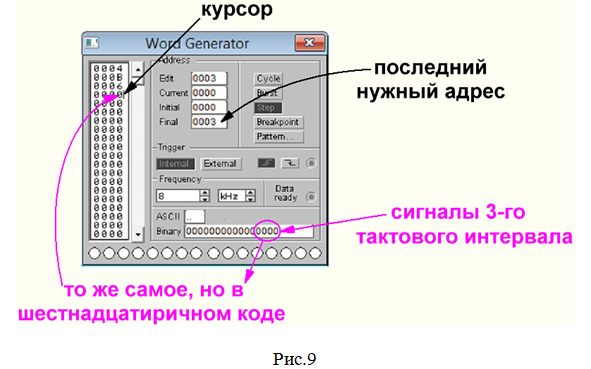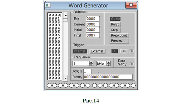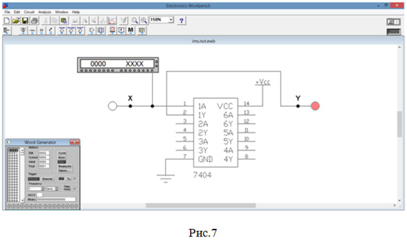 Примечания к пунктам 3, 5, 7. Напоминаем: на панели генератора сигналов в строке Final следует указать адрес последней строки в левой колонке (в данном случае – количество строк таблицы истинности), причем счет начинается с 0: 0000, 0001, 0002, 0003 и т. д.