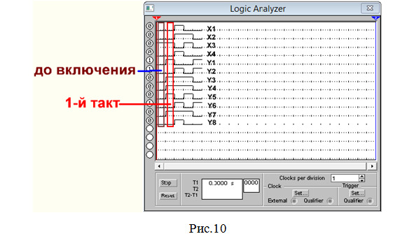 12. Сравниваем показания логического анализатора (рис.10) с построенной временной диаграммой (рис.5) при выполнении предварительного задания и делаем вывод: в рассмотренных 4-х тактах схема работает правильно.