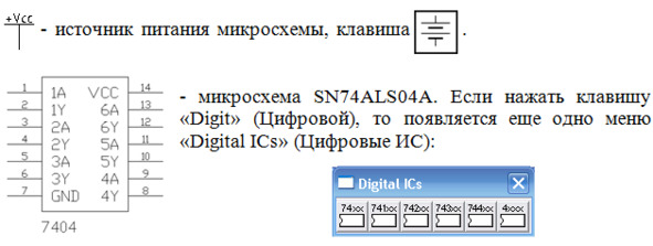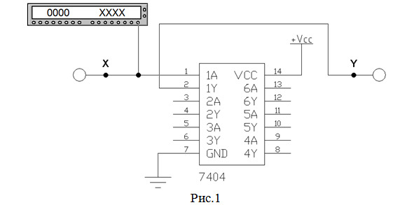 2. Собрать схему (рис.1) для исследования работы микросхемы SN74ALS04А фирмы «Texas Instruments Inc.» (российский аналог – микросхема КР1533ЛН1), содержащей 6 элементов НЕ. Примечание: в схеме на рис.1 используется 1-й элемент данной микросхемы. Учащиеся применяют элемент, номер которого совпадает с номером компьютера.