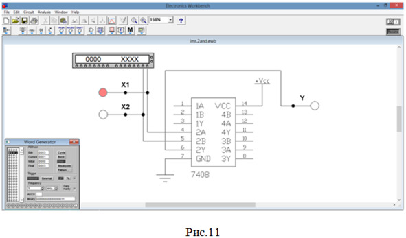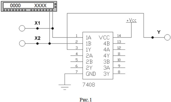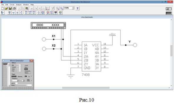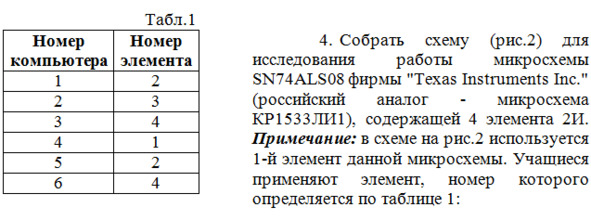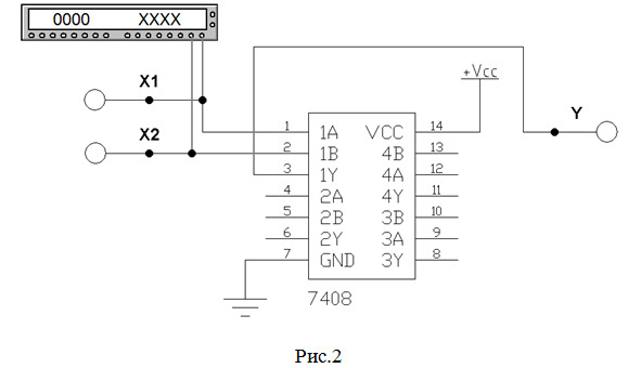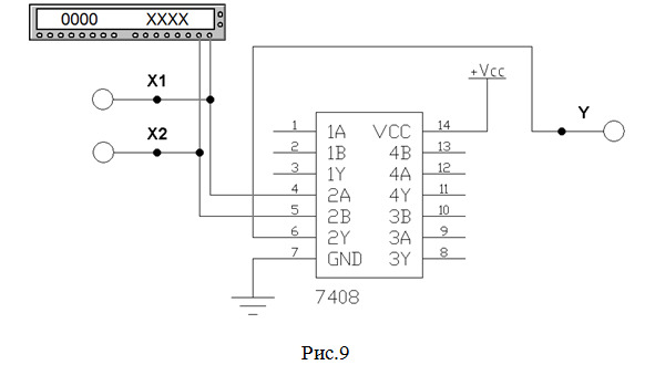 13. Собираем схему (рис.9) для исследования работы микросхемы SN74ALS08 фирмы «Texas Instruments Inc.» (российский аналог – микросхема КР1533ЛИ1), содержащей 4 элемента 2И. Согласно табл.1 будем использовать 2-й элемент данной микросхемы (выделен красным цветом на рис.5).