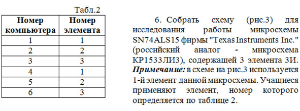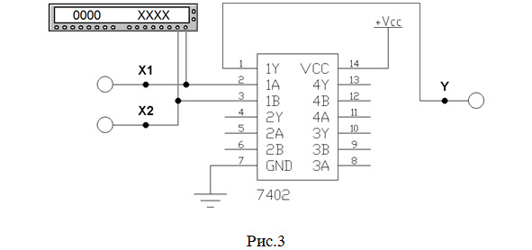6. Собрать схему (рис.3) для исследования работы микросхемы SN74ALS02 фирмы «Texas Instruments Inc.» (российский аналог – микросхема КР1533ЛЕ1), содержащей 4 элемента 2ИЛИ-НЕ. Примечание: в схеме на рис.3 используется 1-й элемент данной микросхемы. Учащиеся применяют элемент, номер которого определяется по таблице 1.