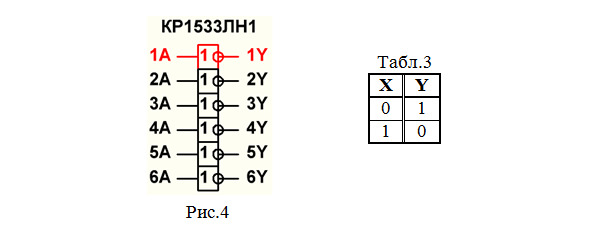 2. Собираем схему (рис.1) для исследования работы микросхемы SN74ALS04А фирмы «Texas Instruments Inc.» (российский аналог – микросхема КР1533ЛН1), содержащей 6 элементов НЕ. Согласно пункту 2 «Порядка выполнения работы» будем использовать 1-й элемент данной микросхемы (выделен красным цветом на рис.4).