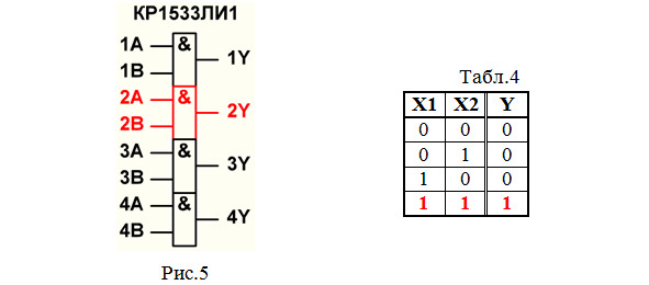 4. Составляем таблицу истинности элемента 2И (табл.4). Этот элемент имеет 2 входа, поэтому в таблице истинности будет 22=4 строки. Напомним, что элемент 2И выполняет логическое умножение 2 сигналов Х1,Х2 и выдает полученный результат на выходе Y.