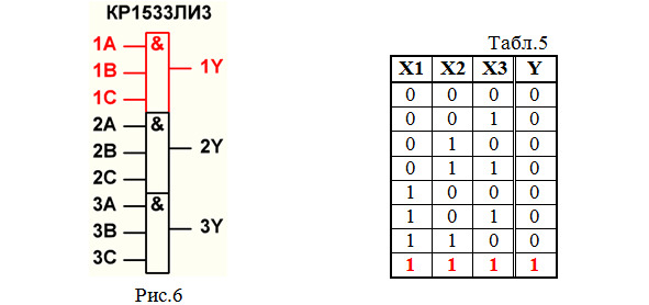 6. Составляем таблицу истинности элемента 3И (табл.5). Этот элемент имеет 3 входа, поэтому в таблице истинности будет 23=8 строк. Напомним, что элемент 3И выполняет логическое умножение 3 сигналов Х1,Х2,Х3 и выдает полученный результат на выходе Y.