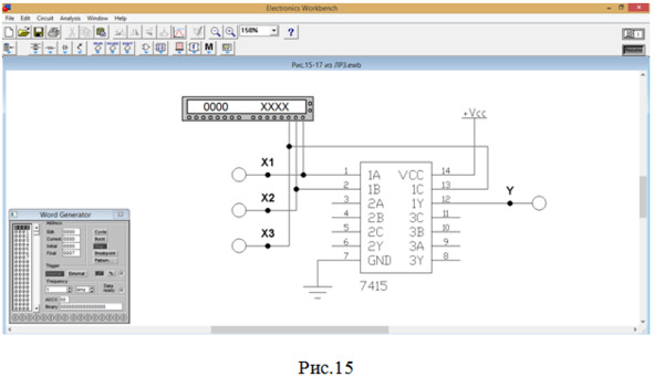 37. Сверяем полученный результат с таблицей истинности элемента 3И (табл.5). Действительно, при подаче на входы Х1, Х2 и Х3 (соответственно 1А, 1В и 1С в микросхеме SN74ALS15) сигналов 0, 0 и 0 на выходе Y (1Y в микросхеме SN74ALS15) формируется сигнал 0 (результат логического умножения).