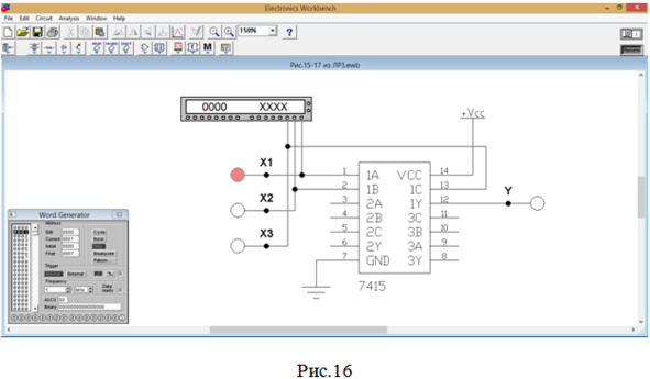 Особо обратим внимание на последнюю 16-ю строку таблицы истинности (в табл.4 выделена красным цветом): при нажатии на клавишу Step 16-й раз (рис.11) видим, что при на выходе формируется сигнал 0 только при наличии сигналов 1 на всех входах.