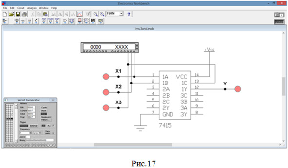 40. Аналогично проверяем остальные строки таблицы истинности и убеждаемся, что только при наличии сигналов 1, 1 и 1 на входах элемента (в табл.5 эта строка выделена красным цветом) формируется сигнал 1 на его выходе (рис.17).